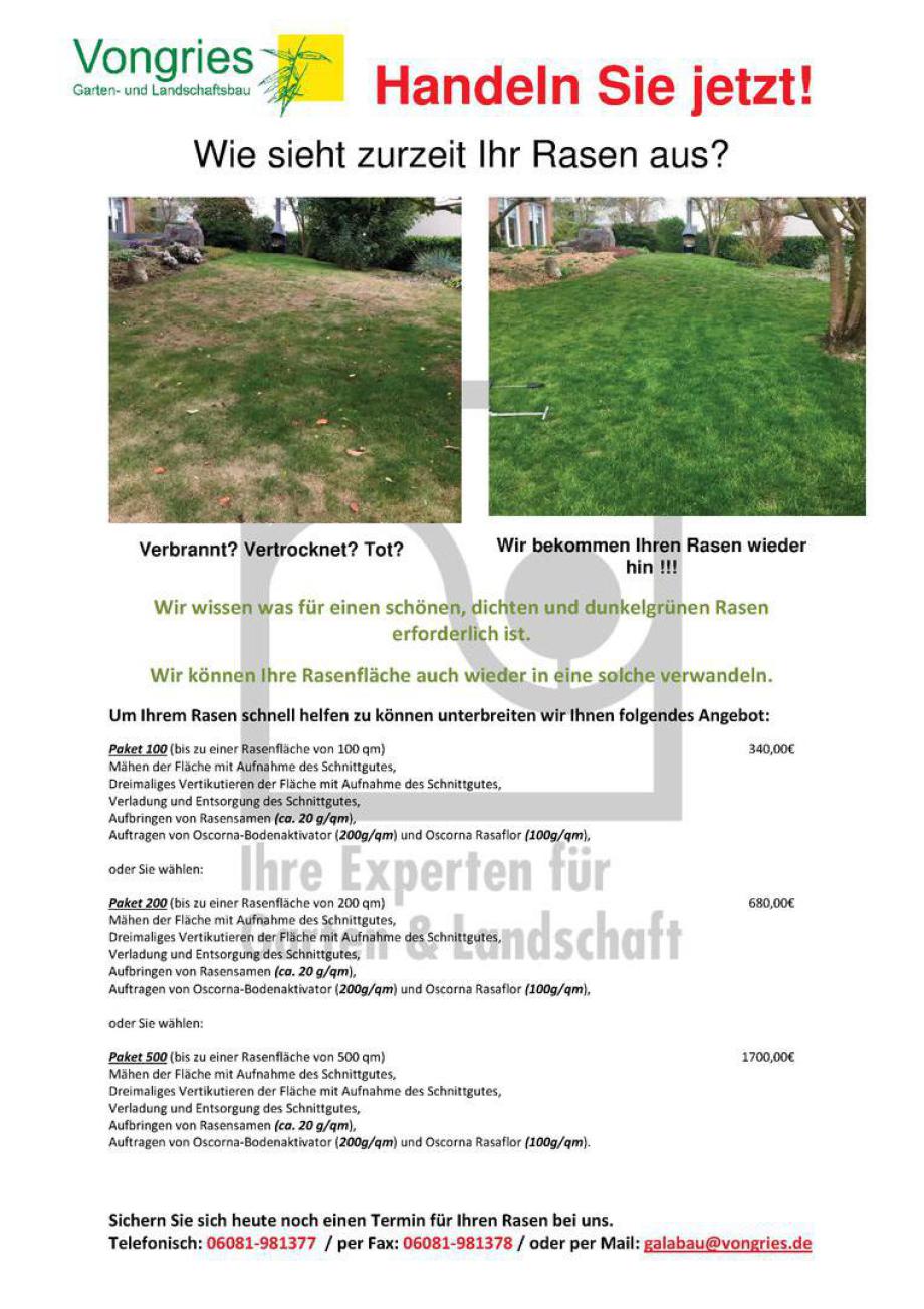 Neben dem Inhaber Andreas Vongries sind zehn Mitarbeiter angestellt, davon ein staatl. geprüfter Techniker Fachrichtung Garten- und Landschaftsbau, sechs Gartenbaufacharbeiter in der Neuanlage, Pflege und Umgestaltung sowie drei Auszubildende im ersten und zweiten Ausbildungsjahr.